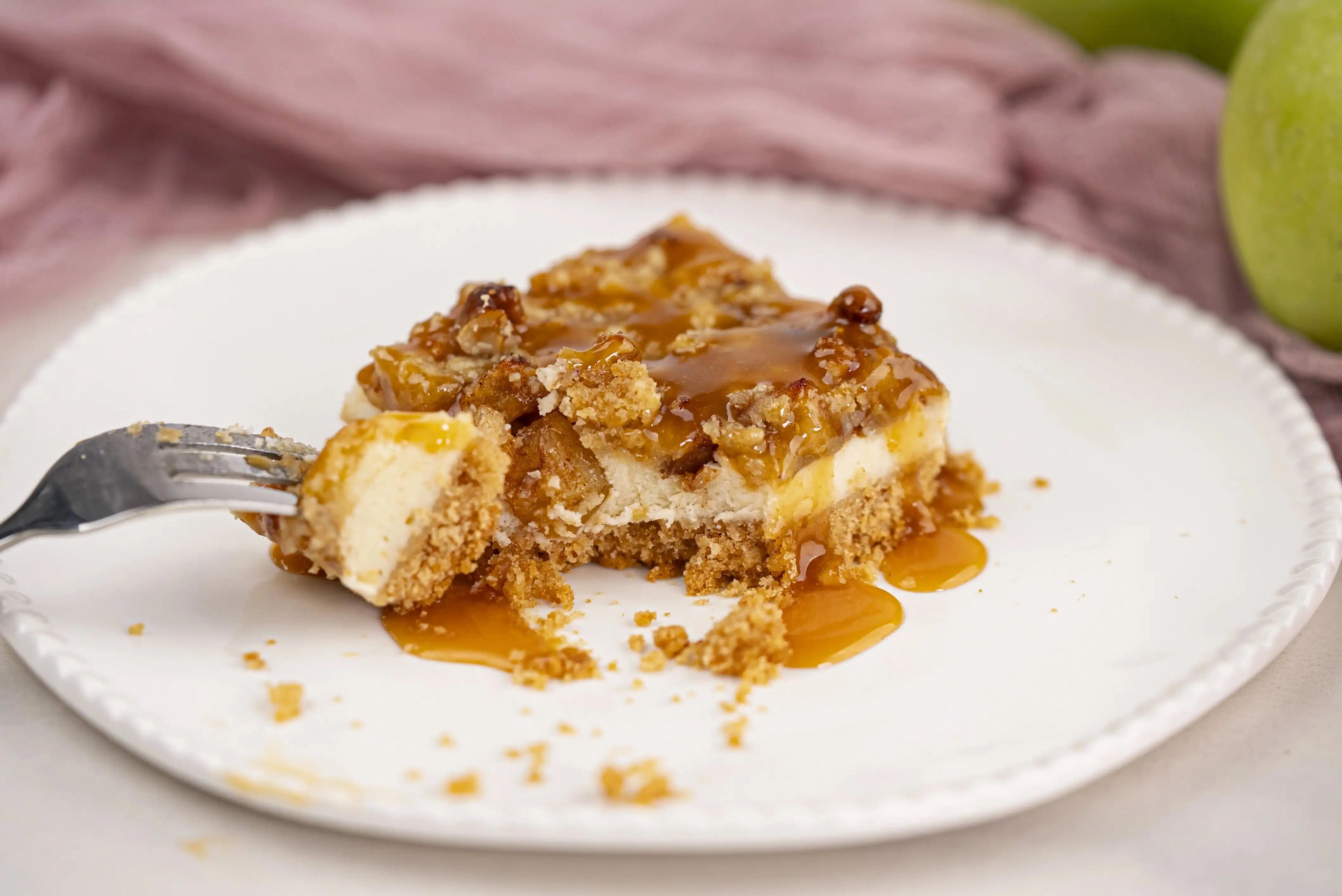 Cream cheese is the heart of the cheesecake filling. Its silky texture and mild tang balance the sweetness of the caramel and apples. The heavy cream adds richness without making the filling too heavy, giving it a luscious, airy quality. Eggs act as a binder, ensuring the filling sets properly while keeping it light. If you’re concerned about the richness, you can substitute part of the cream cheese with Greek yogurt, but that will alter the flavor profile significantly.